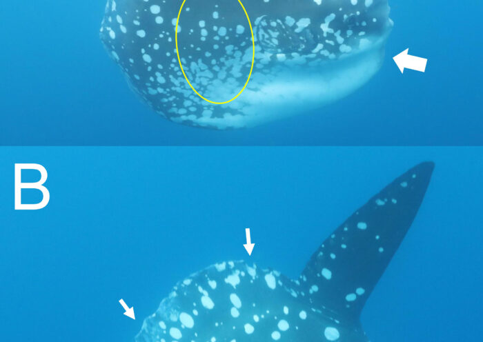 ウシマンボウMola alexandrini (Ranzani, 1834)は,全長3.3 m以上,体重2,700 kg以上の巨体になり,世界中の温帯・熱帯海域に生息するマンボウ科Molidaeマンボウ属Molaの魚類で…