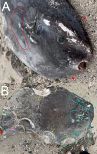 奄美群島に属する鹿児島県の喜界島近海では, マンボウ属のうちウシマンボウの出現が明確に確認されている(Sawai and Yamada, 2019).一方,喜界島ではマンボウに対して「シチャー(シチヤー)」という地方名があるが(澁澤,1942, 1959),おそらくマンボウとウシマンボウを混同して呼んでいたものと推測され,これまでに喜界島におけるマンボウの明確な記録はみあたらない.しかしこのたび,2026 年2 月中旬に喜界島のビーチにマンボウ1 個体が打ち上げられ,喜界島におけるマンボウの確かな記録になると考えられたため,ここに報告する.また,本個体には捕食されたと考えられる外傷が多数あったため,それに関する調査も行った.